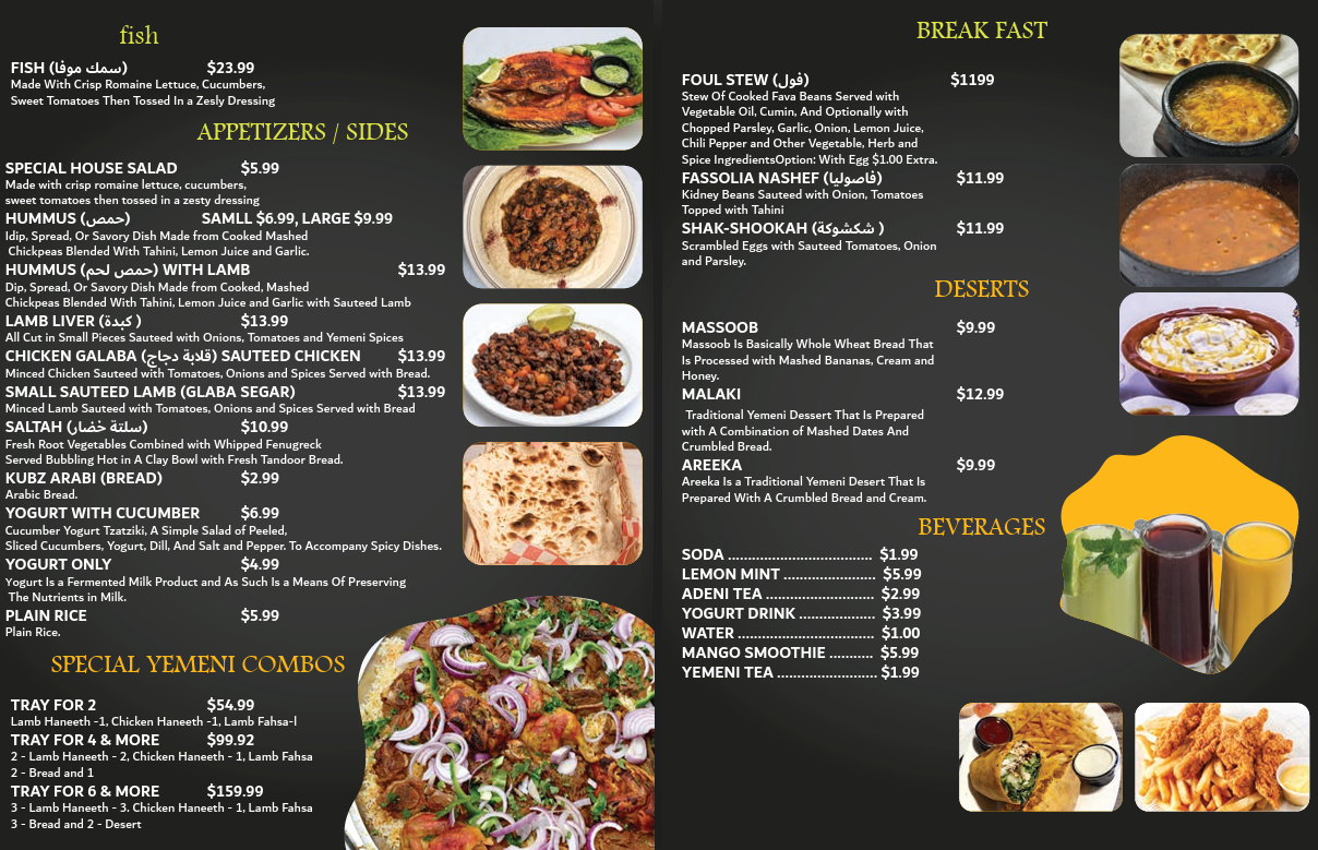 Pure Yemeni Mediterranean cooking is guaranteed to make you want to come back. Our food is prepared by experts who have been creating reliable Yemeni entrees and dishes for years. With our large variety of menu items, you will find something on the menu to make sure you go home pleased!